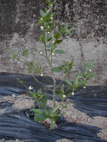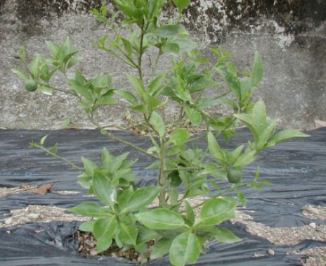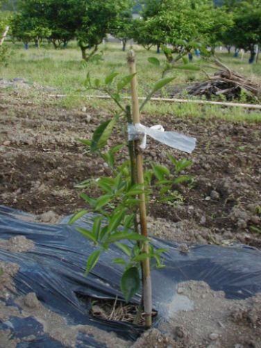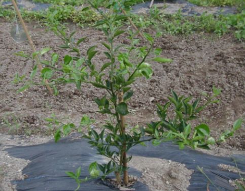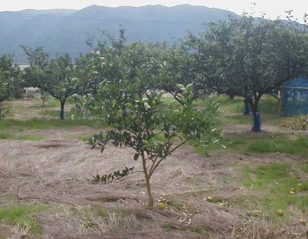 D植え付け後三ヶ月で種無しすだちはこんなに大きくなりました。樹高は30cmほど伸びて70cmになりました、枝も左右にそれぞれ30cm伸びて順調に生育しています。色が濃いのは春枝、そして緑が薄いのが夏枝です。夏枝はエカキムシの害を受け安く、その傷口はかいよう病の伝染源になることが多いので被害枝は剪除します。 |