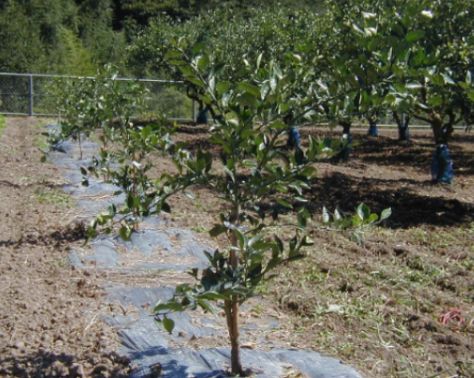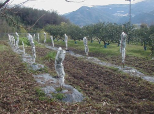 B苗木は早く生長させるために雑草から守ってやらなければなりません、そこで黒マルチをして雑草の抑制や地温を高め土中水分の蒸散を抑えます。 |
