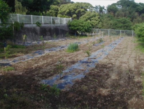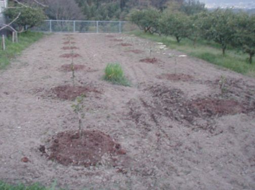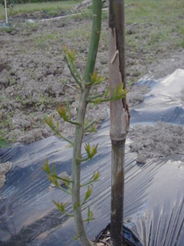 @我が家に到着した時の苗木は1年生苗で高さ1.2mくらいの先の方に少しだけ葉っぱがある一本の細い棒のようでした。植え付け後に地表面から40cmのところで切るようにとの指導があったので切った。なんと畑に棒切れを挿してるような景色になりました。これで枯れないのかな?と少し心配になったので翌日農業支援センターへ電話して聞いてみた。すると「切らずにおいた場合先の葉っぱが生長してヒョロヒョロの樹になるので必ず切ってください。その方が元気な芽が出てきますから」と言われて先ず一安心です。 |