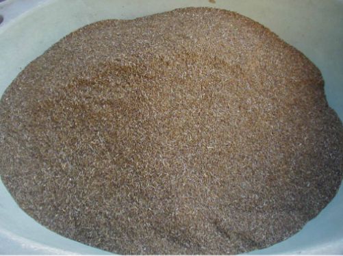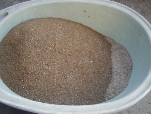 (10月9日) 右の白いのがナギナタガヤ1kg、そして左の濃い色が菜種粕10kg、これを手で混ぜ合わせる。 |