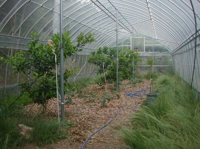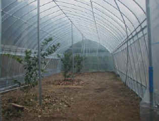 Cハウス内部の様子。この空間も4年後くらいにはレモンの木で狭苦しくなっていることでしょう。後は暇なときに灌水設備と妻の換気(ツマソウ)を作ります。「平成20年10月17日」 |