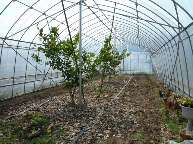 レモンは柑橘類の中で寒さに最も弱く、最低気温が-3℃以下になると樹が枯れることがあります。当園が南国とはいえ、冬には雪も降り、気温が-3℃以下にならないとも限りません。寒さ対策としてハウス栽培をおこなっています。またハウス栽培することにより雨、風から守られ病害虫の影響が少なくなります、結果として農薬散布が減り、安心・安全なレモンの生産が可能となります。 |