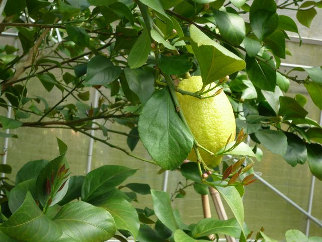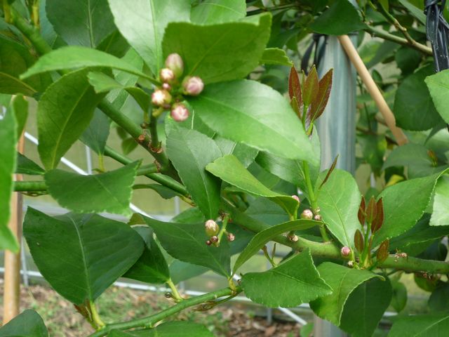 1)苗木の植え付けから1年後、レモンがこんなに大きくなりました、樹高170cm、枝張り170cmです。やはりハウスの中は暖かいですね、3月初めに発芽が始まった春梢は現在30〜50cm伸びました。蕾もたくさん着きましたが摘蕾しました、レモンの実は来年から生らすつもりです。 |
