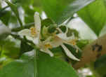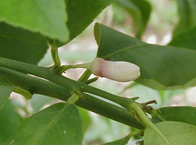 2)摘み取っても次々と蕾が出てきます。レモンの開花は4月下旬頃〜9月頃まで何回か出蕾開花する、四季成りレモンといわれるのはこのためです。そして一本の樹に蕾、花、幼果、収穫前の果実が一緒に生っている状態を見ることができます。「平成21年5月12日」 |