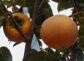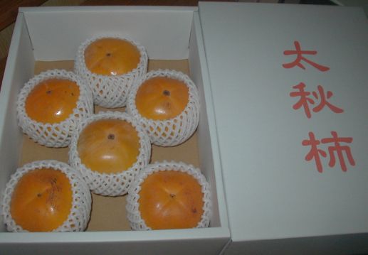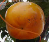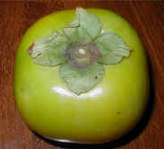 果頂部は着色していても果梗部(ヘタの部分)はまだ青い、でも実は熟れています、これも太秋柿の特徴です。 |
