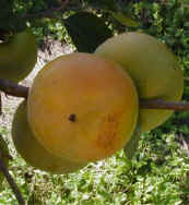 果頂部から色づきはじめました、条紋が出ているので糖度は十分です。このように太秋柿には黒いキズのようなひび割れが出ます、これを「条紋」と呼び実が熟した証とされています。表面が青くても実は熟れています。 | |||||